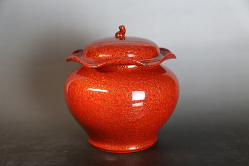 本件作品造型就取自荷葉蓋罐的飽滿雄渾,氣韻生動(dòng)的氣質(zhì)。尤其是“荷葉蓋罐”之名稱,蘊(yùn)含“和”與“冠”之吉祥彩頭而備受仕人追捧。此盒通過古法技藝制做,披麻上灰,入原料銀朱、朱砂、黃金等細(xì)粉入漆,制作出紅金斑犀皮漆荷葉罐色澤華麗鮮明,給人流動(dòng)的韻律感。它的問世讓我們感受了現(xiàn)代徽州漆器之美名噪中外的藝術(shù)魅力。
