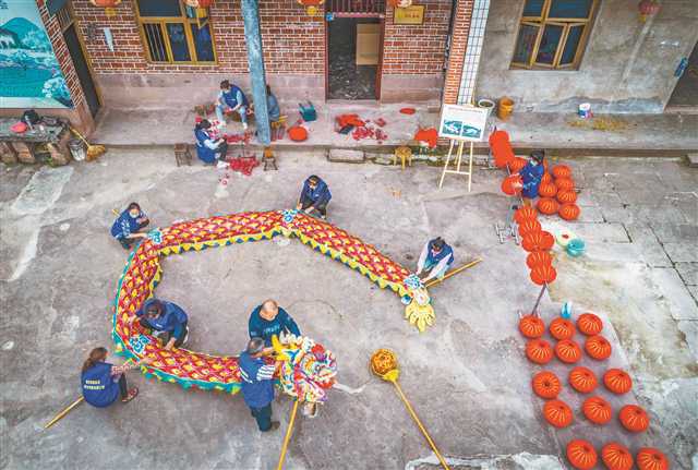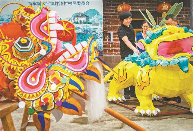 銅梁區(qū)太平鎮(zhèn)坪漆村龍燈彩扎基地,村民正在學習龍燈彩扎制作工藝,通過制作龍燈、燈籠等增收致富。