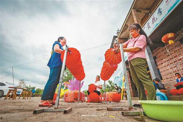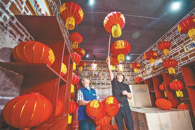 銅梁區(qū)太平鎮(zhèn)坪漆村龍燈彩扎基地,周建(右)和周光學(左)正在檢查制作好的燈籠是否達標。55歲的周光學是坪漆村的村民,跟著周建學習龍燈彩扎手藝,去年在家門口務工就增收6000多元。