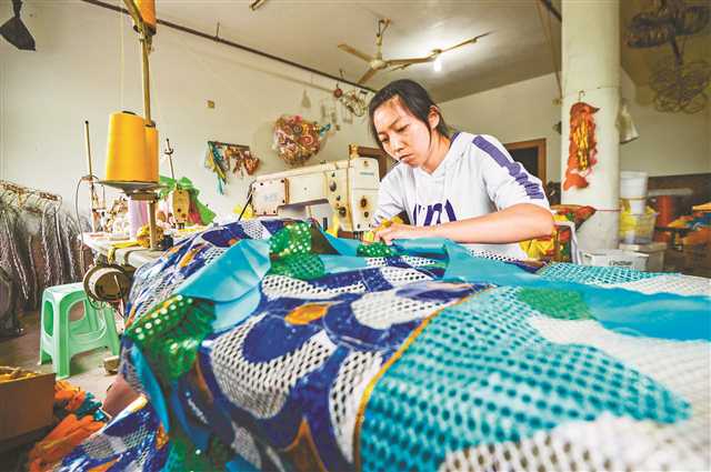 5月25日,銅梁區(qū)太平鎮(zhèn)新藝龍燈制品彩扎廠,周建的女兒正在進行龍燈龍身布料制作。
